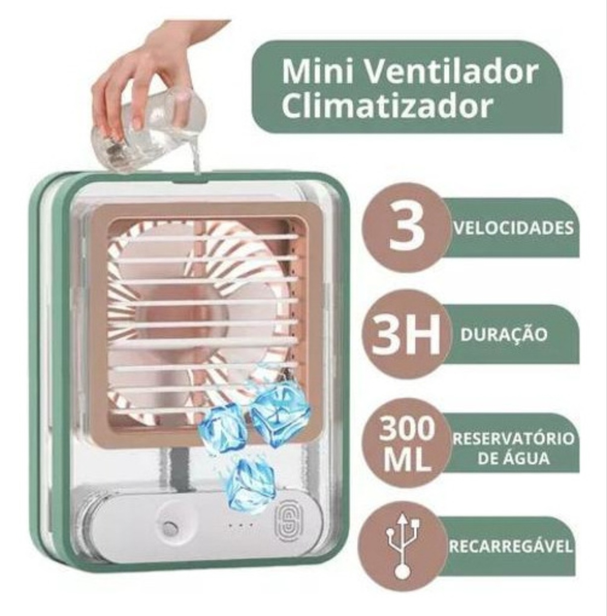 El objeto es un mini ventilador humidificador portátil Valecom, recargable y compacto.